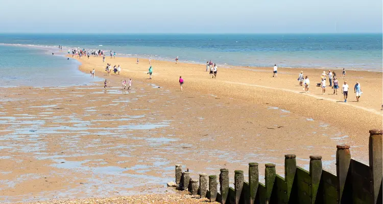 This spot appears in many lists of the best beaches near London. According to guides, it’s “perfect for families and regularly draws crowds who come for paddling in the shallow lagoons or hitting the waves”.