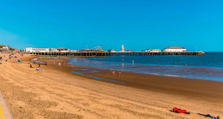 Clacton-on-Sea is a staple when looking for British beaches near London that offer a traditional family day out. If you want the full “English Riviera” experience with piers, arcades, and candy floss, this is the place to go. It features a large, clean sandy beach and a massive Victorian pier that was recently refurbished, making it one of the best closest beaches london has to offer for keeping children entertained all day.